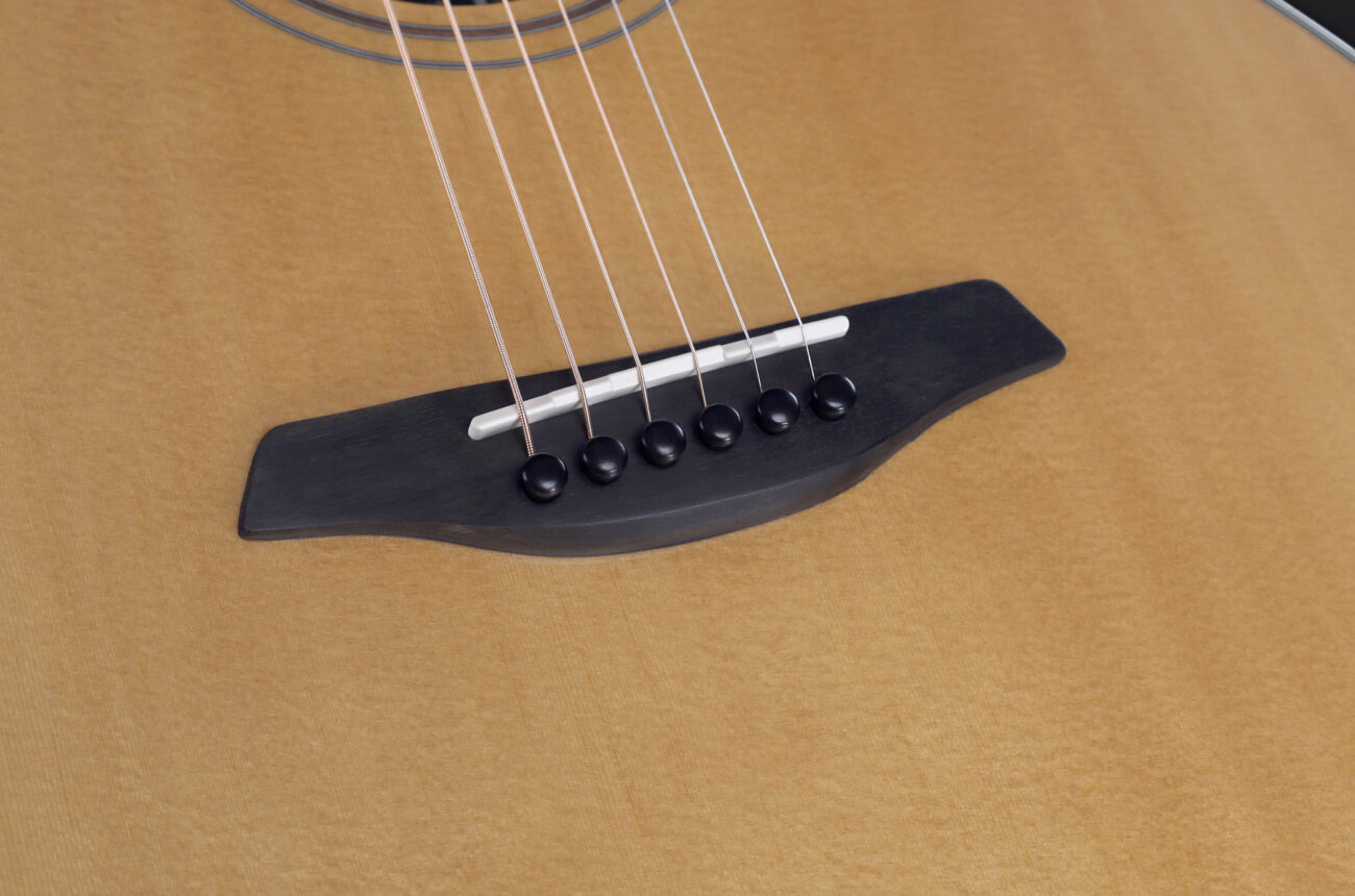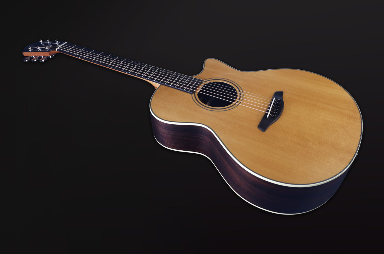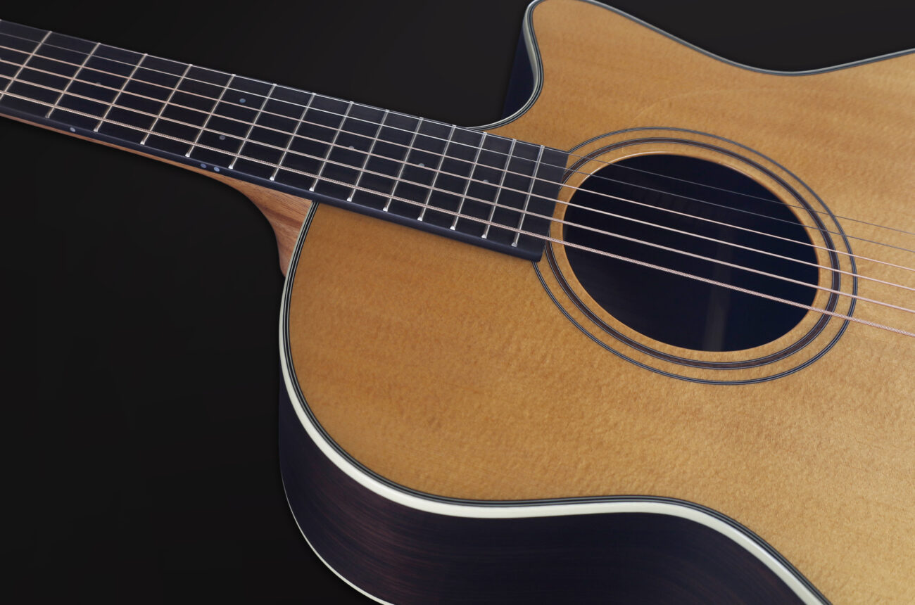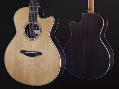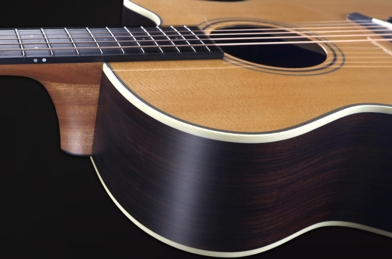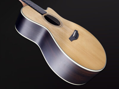 - Decke aus torrefizierter Sitka-Fichte, die durch einen proprietären Torrefizierungsprozess künstlich gealtert wurde. Dies fördert eine klangliche Reife mit verbesserter Ansprache, erweitertem Dynamikumfang, wärmerem, offenerem Klangcharakter sowie einer dezent dunkleren, vintage-inspirierten Optik
