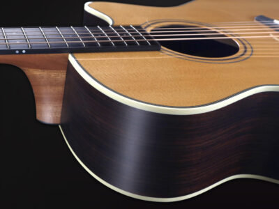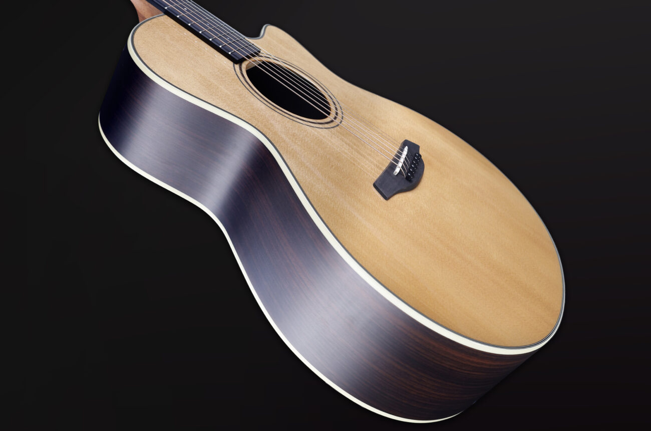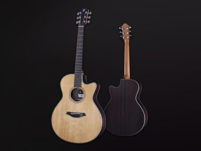 Die Decke ist mit unserer proprietären Full-Pore High-Gloss Lackierung versehen, die entwickelt wurde, um die natürlichen Resonanzeigenschaften der Hölzer zu unterstützen, während Boden und Zargen in Full-Pore Satin ausgeführt sind, was eine elegante Optik und eine angenehme Haptik bietet. Das Zusammenspiel von torrefizierter Sitka-Fichte, indischem Palisander und präzise aufgetragenen Lackierungen sorgt für einen reichen, ausgewogenen Klang über das gesamte Frequenzspektrum mit brillanten Höhen, starker Projektion und ausgezeichnetem Sustain.