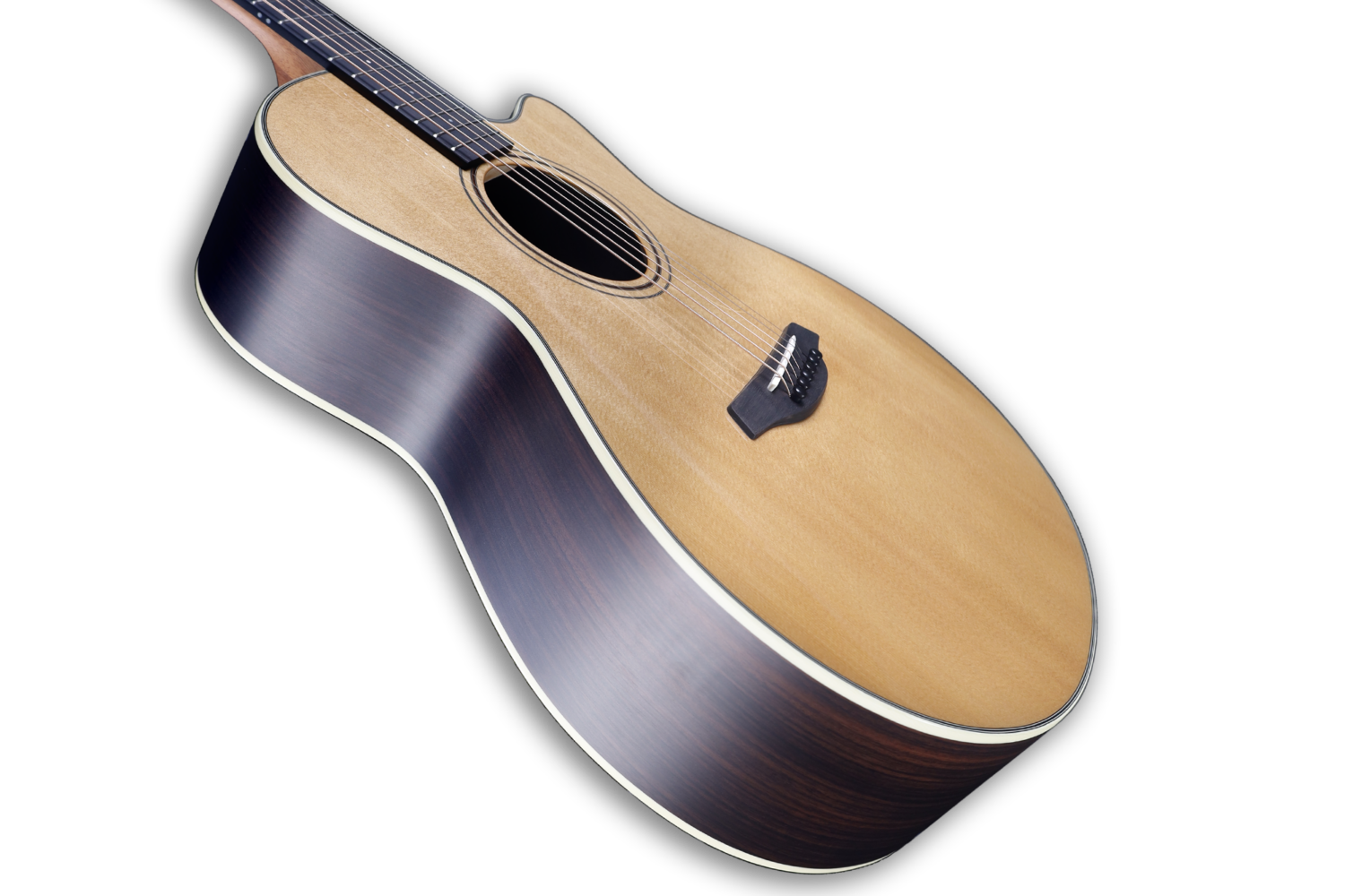 - Decke aus torrefizierter Sitka-Fichte, die durch einen proprietären Torrefizierungsprozess künstlich gealtert wurde. Dies fördert eine klangliche Reife mit verbesserter Ansprache, erweitertem Dynamikumfang, wärmerem, offenerem Klangcharakter sowie einer dezent dunkleren, vintage-inspirierten Optik