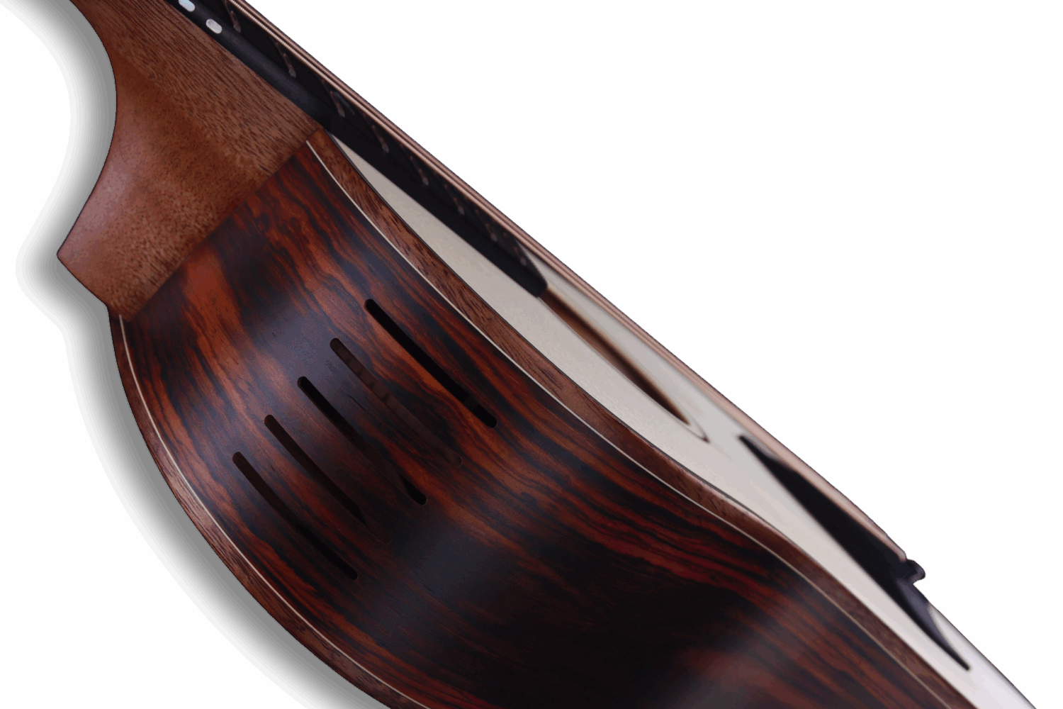 Die Pioneer Exclusive-EC ist mit einem Binding aus hochwertigem, stark geflammtem Koa mit weißer Kontrastlinie versehen, das die massive Decke, den Boden und die Zargen elegant einfasst. Dieses feine Detail unterstreicht die natürliche Schönheit der ausgewählten Tonhölzer und verleiht dem Instrument eine besondere Raffinesse und optische Ausdruckskraft.