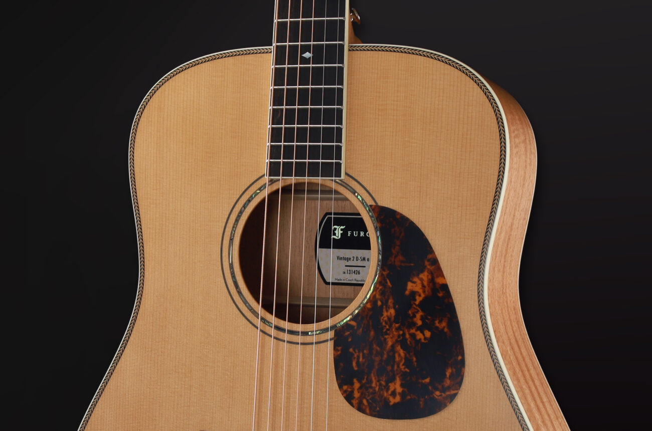 The Vintage 2 SM is finished with our Full-Pore Vintage Finish, a thin, resonant UV-cured coating that enhances the natural acoustic properties of the wood while offering lasting protection. Thanks to a buffing process that creates a subtly hand-brushed aesthetic, the surface develops a soft patina reminiscent of early 20th-century instruments. Its visual character is elevated by elegant appointments including a green abalone rosette, herringbone purfling, faux ivory binding, and mother-of-pearl details, all contributing to a distinctly vintage aesthetic.